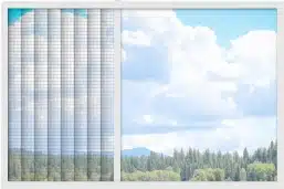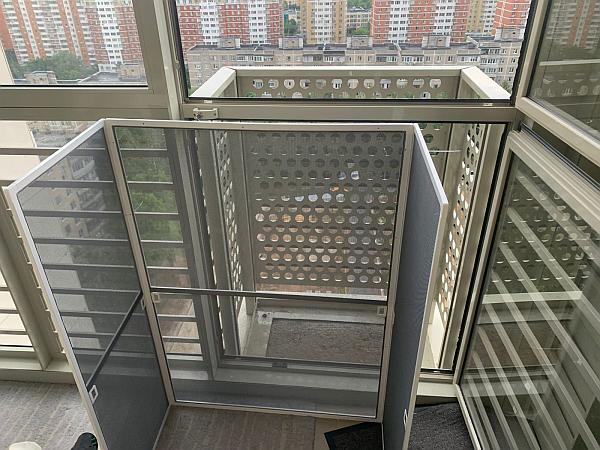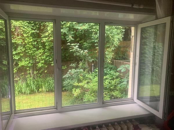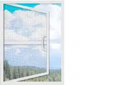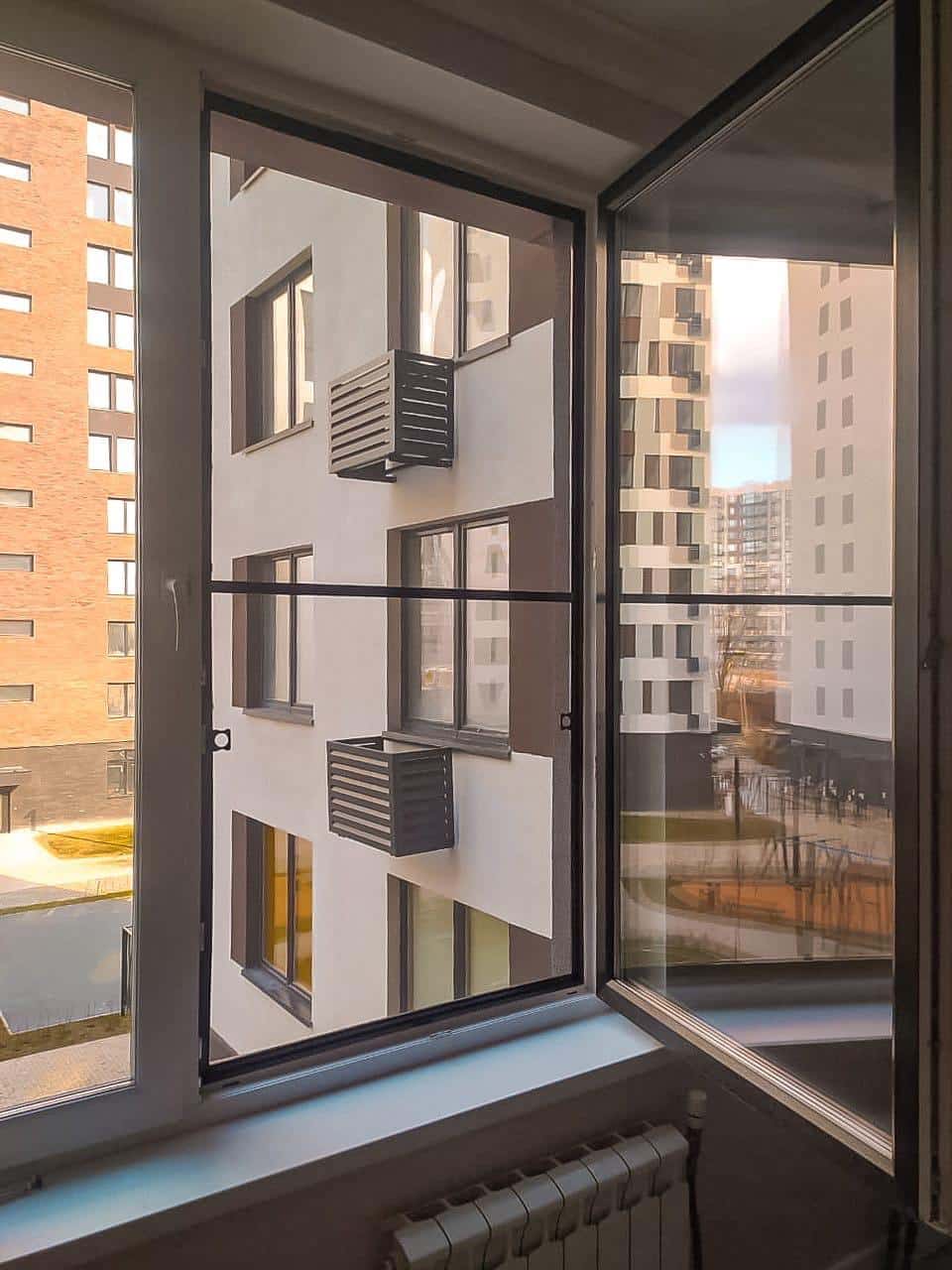 Москитная сетка дублирует открытие/закрытие створки. Полотно установлено в жесткую раму, оснащенную петлями. Фиксация выполняется на внешней стороне окна и открывается аналогично активной створке.