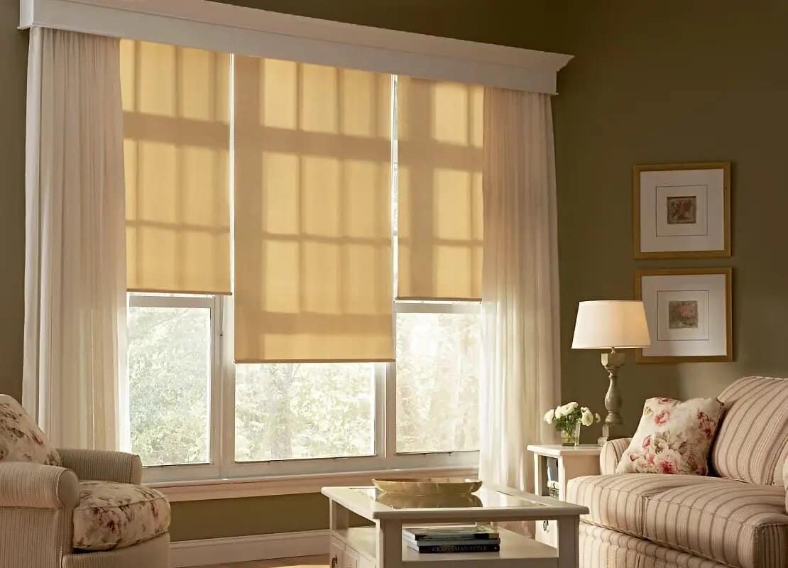 Интересный и недорогой вариант, который представляет собой полотно, намотанное на вращающийся вал. Конструкция устанавливается над окном. На нижней части закреплены утяжелители, что упрощает расправление и фиксацию в боковых направляющих.
